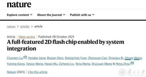 北京时间10月8日晚,复旦大学集成电路与微纳电子创新学院周鹏、刘春森团队在《自然》(Nature)期刊上发表题为《全功能二维-硅基混合架构闪存芯片》(A full-featured 2D flash chip enabled by system integration)论文。率先研发出全球首颗二维-硅基混合架构闪存芯片,攻克了新型二维信息器件工程化的关键难题,为新一代颠覆性器件缩短应用化周期提供范例。